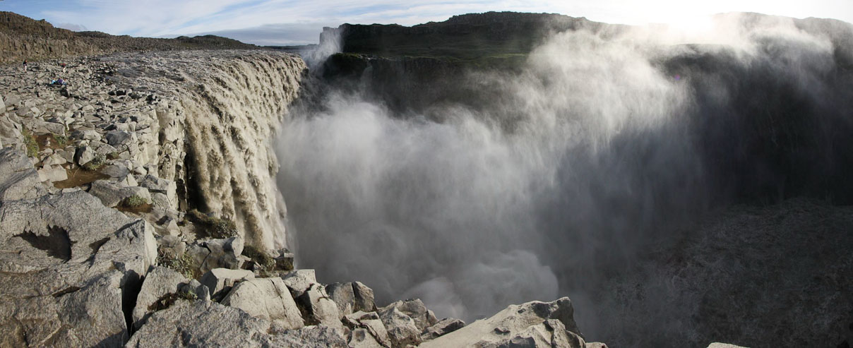 We head back to the ring road, and drive east for ~1hr, until we reach the turn-off for Dettifoss, the largest volume waterfall in Europe. It's a 30km drive on a gravel road, which Wendy largely sleeps though. I make good time on the road, averaging 80km/hr. Several cars at this remote parking area. Wow, there is truly a massive amount of water at Dettifoss. I take lots of pics.