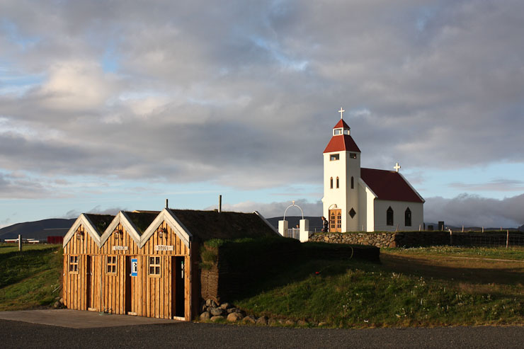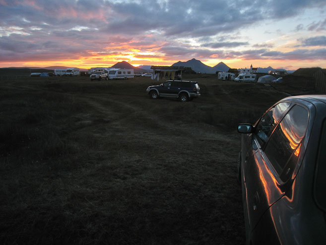 Once back to the car, we drive back to Ring Road (again good speed across the gravel roads -- helps having a large Ford Taurus to keep things smooth), arriving ~8:05pm. Time to decide where to stay tonight. We could camp in a fishing village (after a long drive), or camp in a farm just 40 minutes away. We end up deciding on the farm (which also has a café). After a 40 minute scenic drive, we arrive, and discover that the place looks amazing! It's like disneyland with a Icelandic old-time village theme. We inquire about accomodations, fully expecting to have to camp, but there is a 2 bed sleeping bag accomodation room available, for just 6300isk! We take it, and each buy a bottomless bowl of lamb soup at the cafe. The lamb is from a local farm. Yummy! We eat 4 bowls each, along with some of the bread we bought. We are both very happy to end up at this place. The more we explore, the more amazed we are.