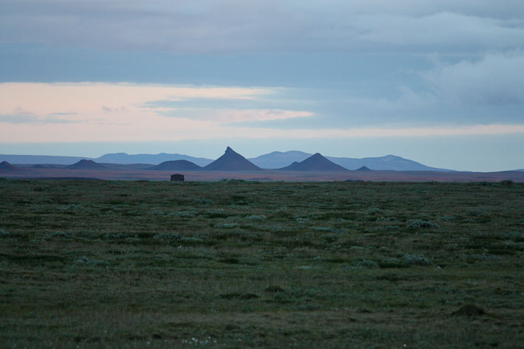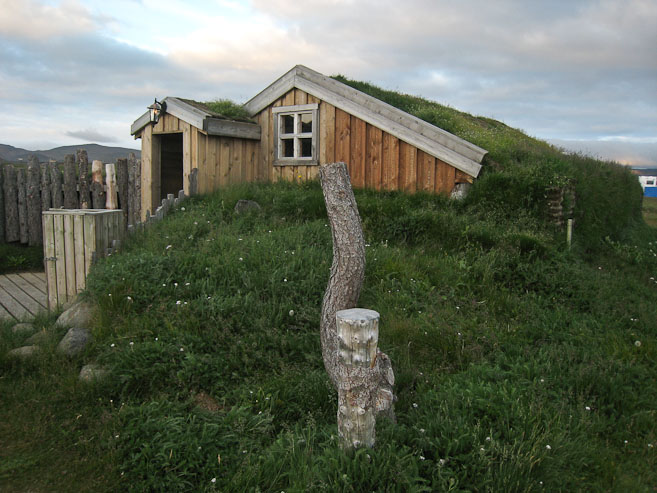 The camp kitchen is like a museum re-creation of a viking shelter. We drive across a bumpy/uneven grassy field to reach our grass roofed room for the night. I eat a few bowls of cereal (milk, granola, protein powder, jelly, PB), while Wendy goes off to take pics of sunset. It's getting cold. The sun sets at 10:30pm now. We're losing 6+ minutes of sun per day, and it's getting noticeably darker at night since we arrived 10 days ago.