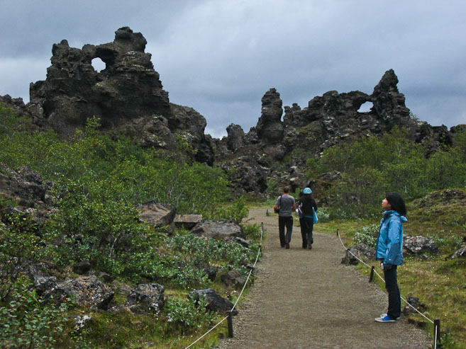 Next we drive to Hofdi (where we got confiused last night), and follow a short trail through the forest that leads to a view above the lake. We don't spend long here, and soon drive to Dommel café, the next attraction up the road. There are lava formations, and some arches, but nothing compared to Moab. We abort early here again.