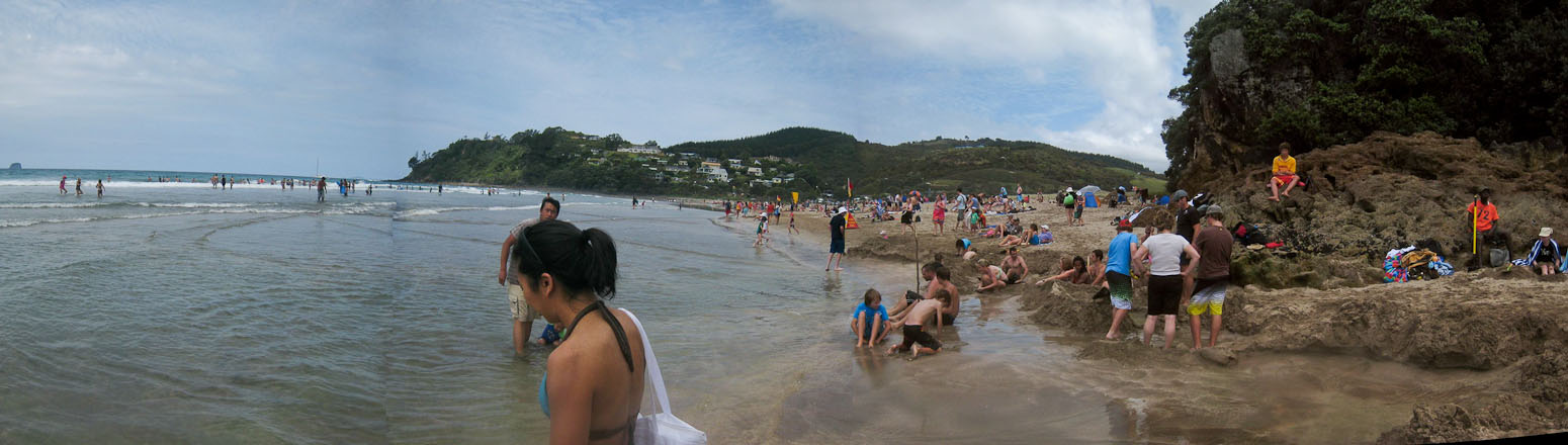 We reached the very crowded beach front ~1pm, and rented a shovel for $5NZD at the store. The beach was scenic, and the overcast skies were finally thinning, allowing the sun. It was certainly bathing suit weather out. We walked along the beach towards a mass of people gathered in front of a rocky outcropping, and observed the many pools in the sand.