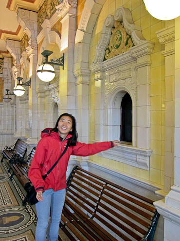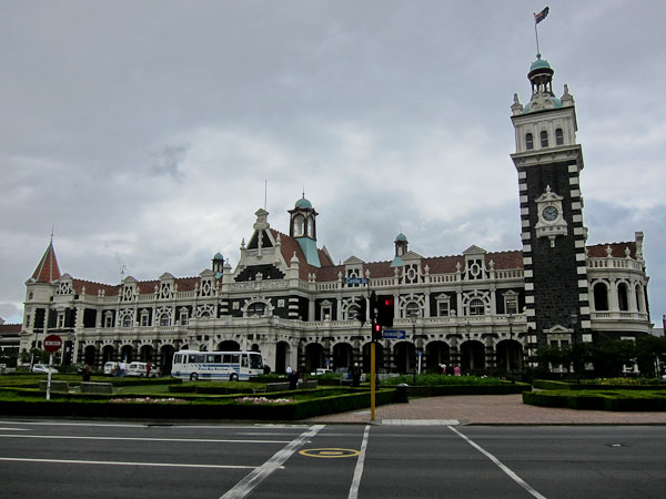 It was all cloudy, but no rain this morning. Wendy and I walked from Hogwartz down to the city center (a few minutes), stopping at a couple scenic churches on the way. Dunedin is known for it's architecture. We checked out some shops and eateries on the way to the railroad station, which is NZ's most photographed building. There was an art gallery in the top floor.