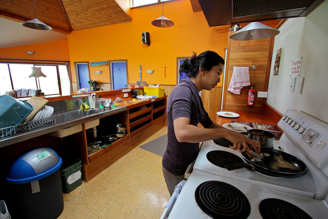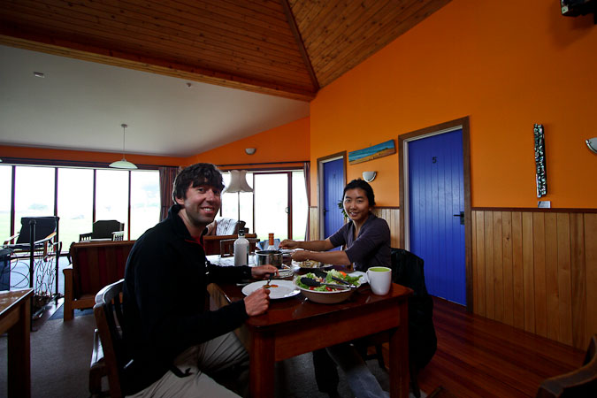 We then drove north to our hostel, Old Bones, outside of Oamaru. It has the highest rating of all the BBH backpackers (96%), and as we arrived, we realized why. It's located in an isolated field just above the shore, in one of the most serene locations imaginable for a $60 room. Then when we stepped inside, we were even more impressed. The place was a giant room comprising of a kitchen and lounge, with 8 bedroom (pods) on the sides, each with a door to the outside. There was a shoes off policy which meant that the floors were really clean. There was also a nice wood burning fireplace and wood fire. The bedrooms had radiant heating in the floors. Wendy said she'd be happy spending several days here. On top of everything, there was free wi-fi here too!