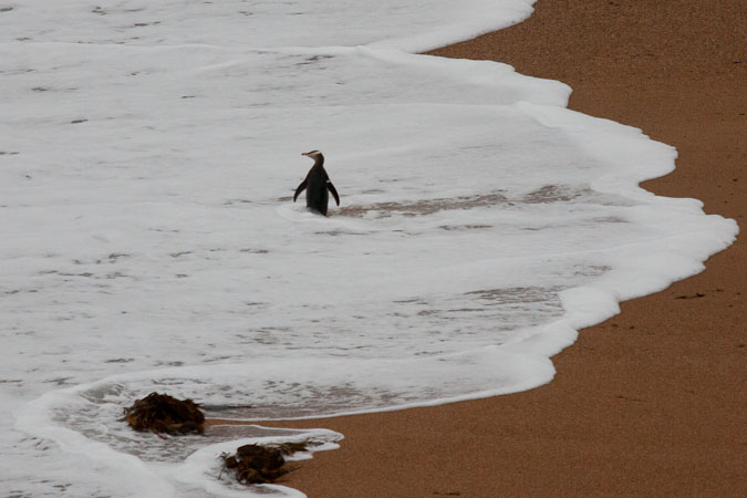 After waiting a while, a penguin came out and waddle along the shoreline...
