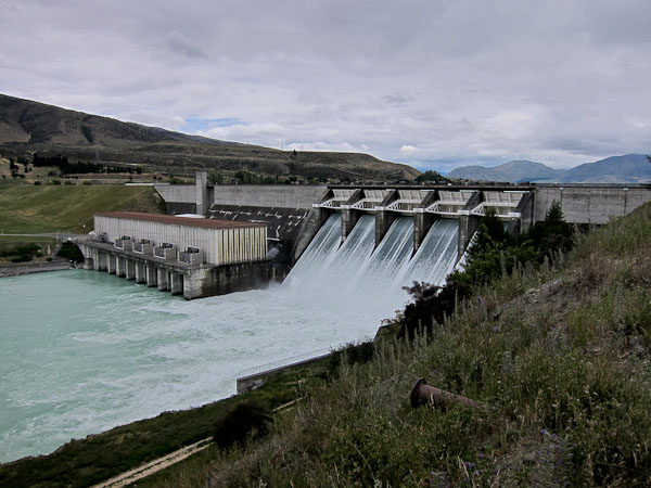 I filled up on some cheap east coast gas, while Wendy went to New World and bought some groceries. Then we drove west with a low blanket of cloud covering north to south, with sporadic soup dripping form the skies. The terrain was plain by NZ standards. Eventually we passed by a large green lake, and stopped to check out a hydro-dam releasing beautiful symmetrical waterfalls.