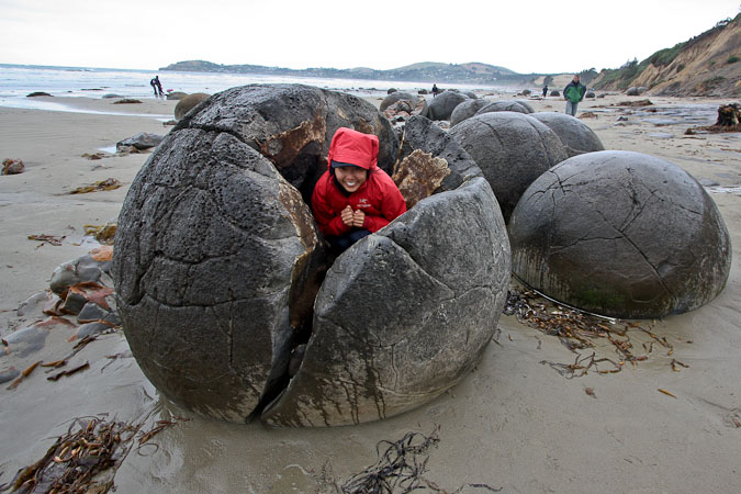 From this afternoon: Wendy: "What's the name of this place?" Matt: "Twizel" (pronouced Twy-zel) Wendy: "Then Twizel is the place a hate the most here`" Our room at Old Bones (the highest rated backpacker in NZ) was toasty with the radiant heating, and fire burning stove in the main room. We slept well, and were up at 8:30am to pack and have yogurt with bananas for breakfast. It was heavily cloudy again today, with mist developing as we departed ~10am. The weather forecast for Mt Cook looked adequate for our Mueller hut trek tomorrow, but before leaving the east coast, we made a return trip (20km) to the Moeraki Boulders, to visit them during low tide. Similar to yesterday, the wind and light rain were in force along the beach, but this time we had lots of sandy real estate available to explore the round smooth boulders.