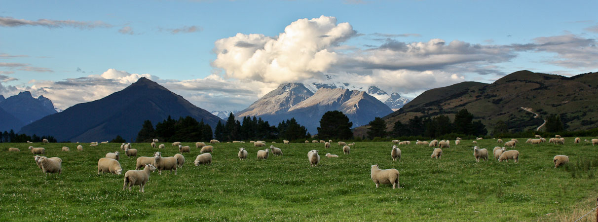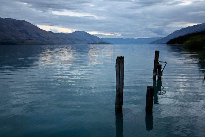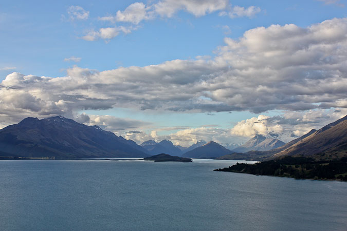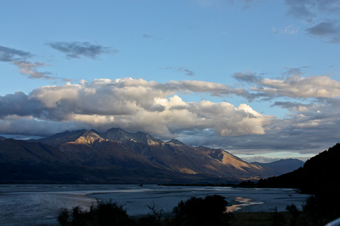 Continue back to Twizel, and then south towards Cromwell under heavy clouds, before climbing a pass and descending west towards Queenland under blue skies and big puffy white clouds. As we get cell phone reception, we book lodging at the Kinoch youth hostel (also a BBH) outside of Glenorchy.