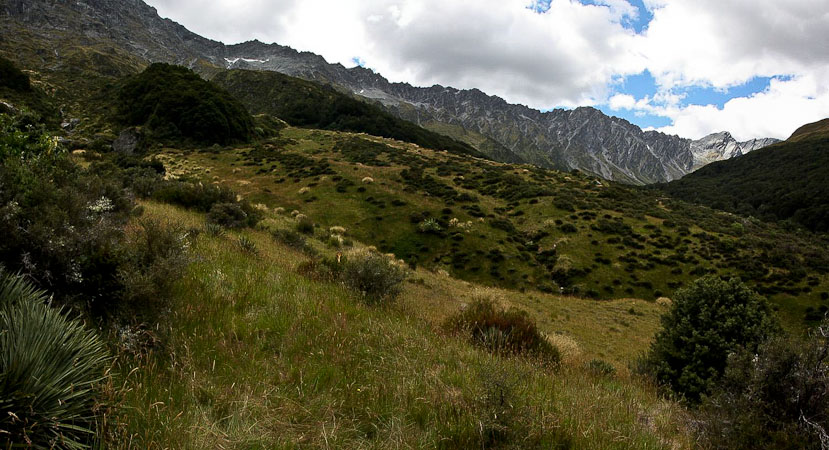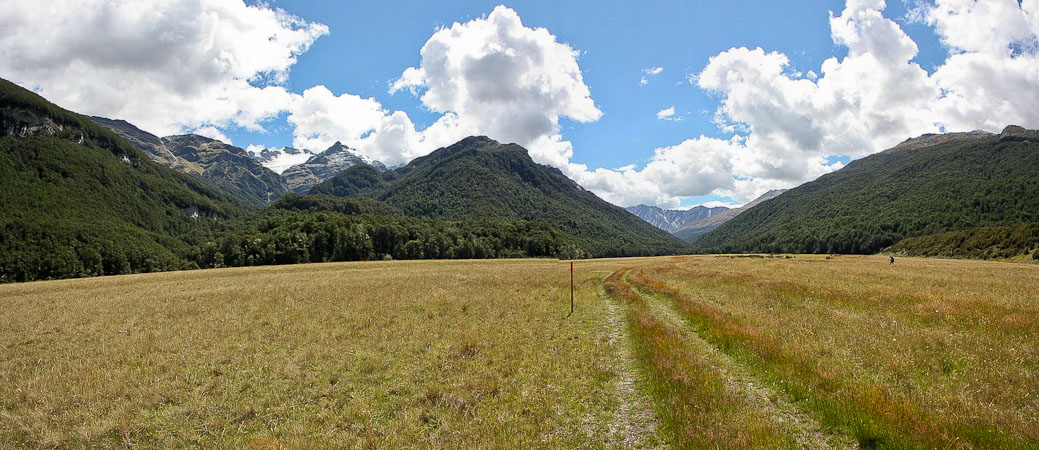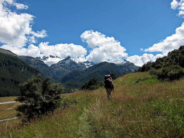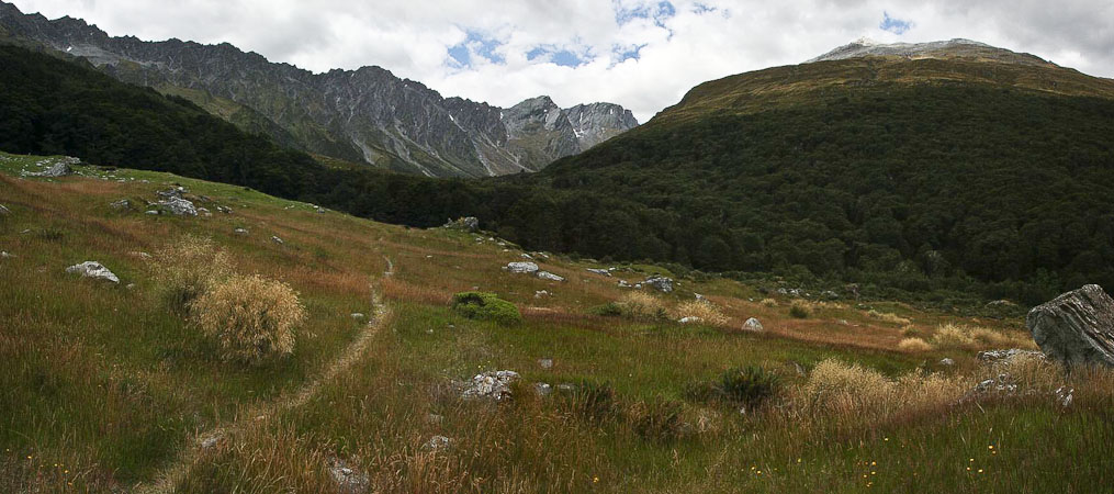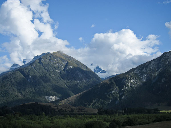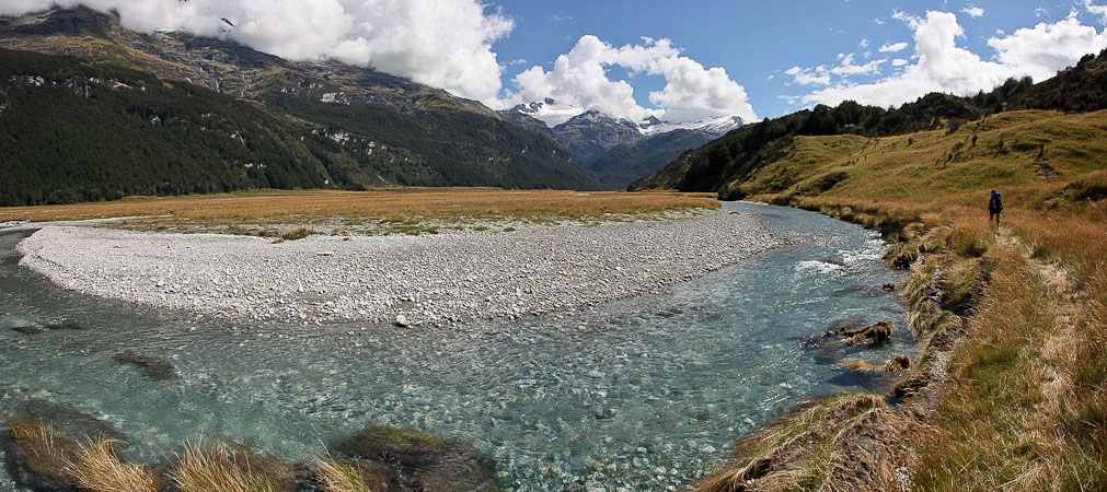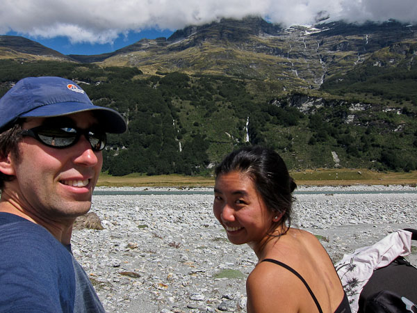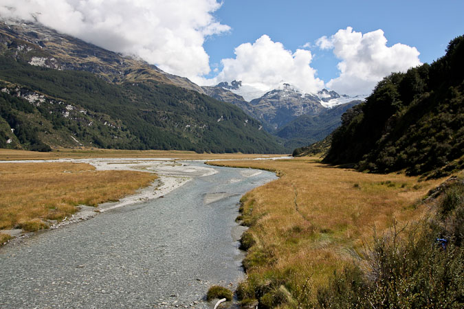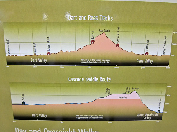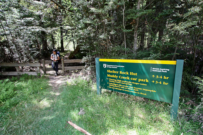 Back to paper and pen journal, the old fashioned way. No MacBook Air on this tramp… Woke up with the 6:30am alarm in Kinolch to a mix of clouds and blue sky. Loaded our packs, cooked 6 eggs with onions and tomatoes, packed the car, and hit the road before 8:15am. The view of "Isengard" across the Dart bridge was clouded over. When we reached Glenorchy, we stopped at the Dart Raft office to collect info on our jetboat pick-up (10:30am in 5 days, ~10 minutes past the swing bridge below Sandy Bluff, ~2.5hrs from Daleys Hut). With our jetboat pickup arranged, we head to the Holiday Park to park our car ($3.50/day=$14), and pick up the 9:15am shuttle ($30). The bus is full, and we are last on board, but the front seats are open, so we get great views during the ~30 minute ride to Muddy Creek Trailhead. The driver points out some areas where "lots of movies are filmed". I know Willow, LOTR, and others were filmed here.