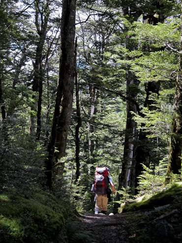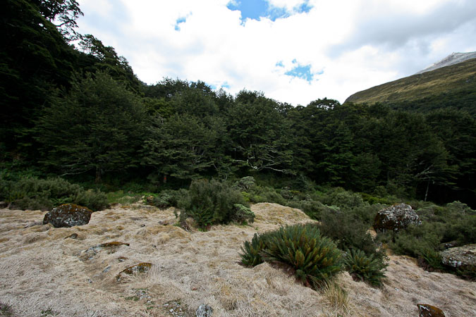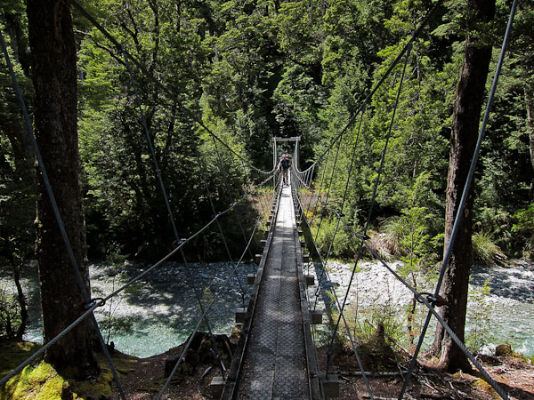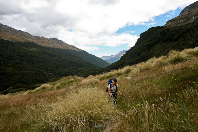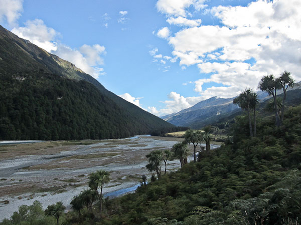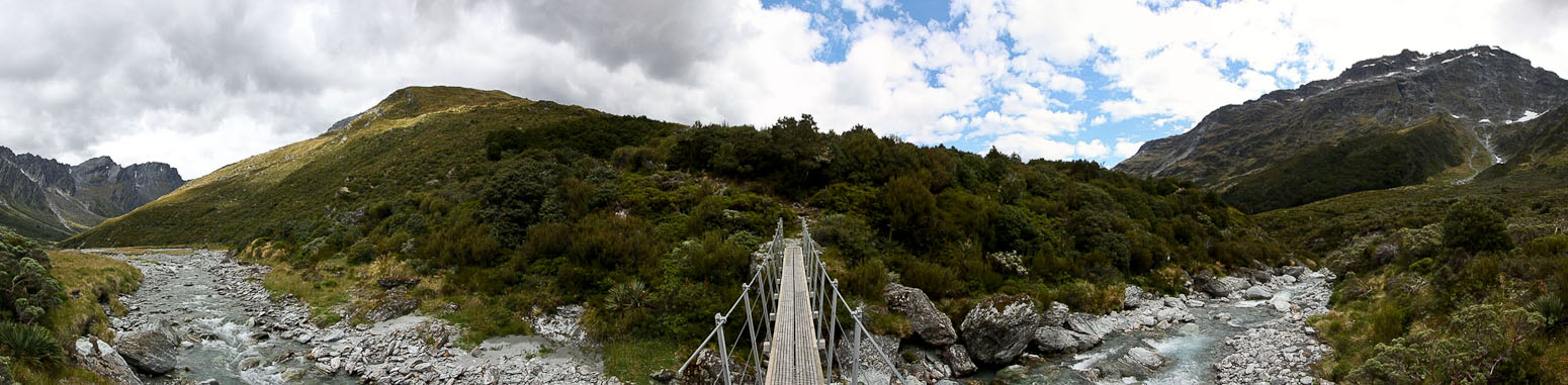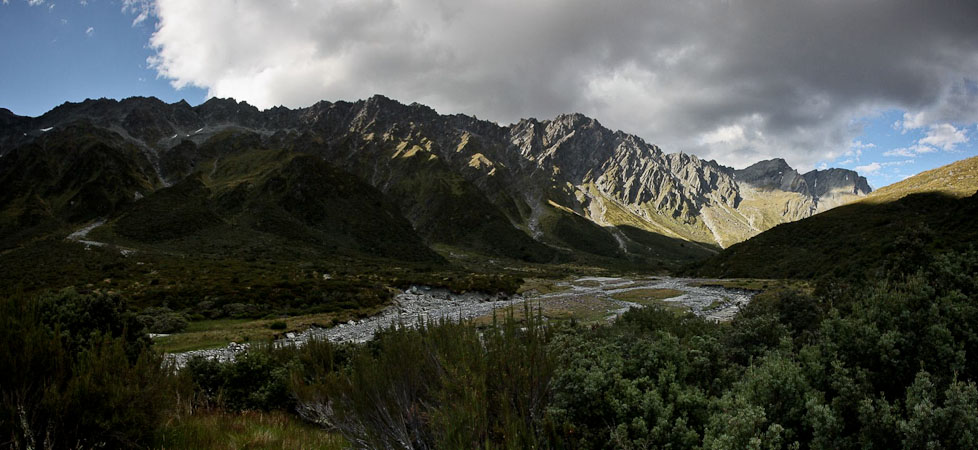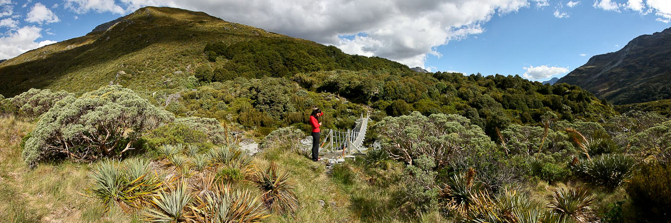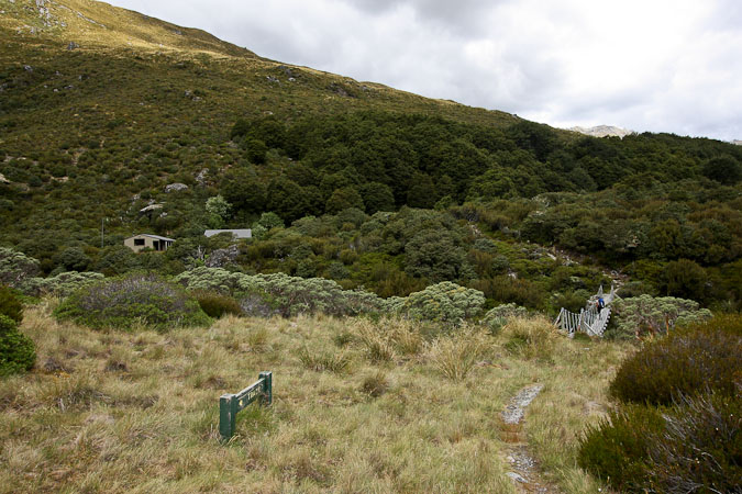 Back to paper and pen journal, the old fashioned way. No MacBook Air on this tramp… Woke up with the 6:30am alarm in Kinolch to a mix of clouds and blue sky. Loaded our packs, cooked 6 eggs with onions and tomatoes, packed the car, and hit the road before 8:15am. The view of "Isengard" across the Dart bridge was clouded over. When we reached Glenorchy, we stopped at the Dart Raft office to collect info on our jetboat pick-up (10:30am in 5 days, ~10 minutes past the swing bridge below Sandy Bluff, ~2.5hrs from Daleys Hut). With our jetboat pickup arranged, we head to the Holiday Park to park our car ($3.50/day=$14), and pick up the 9:15am shuttle ($30). The bus is full, and we are last on board, but the front seats are open, so we get great views during the ~30 minute ride to Muddy Creek Trailhead. The driver points out some areas where "lots of movies are filmed". I know Willow, LOTR, and others were filmed here.