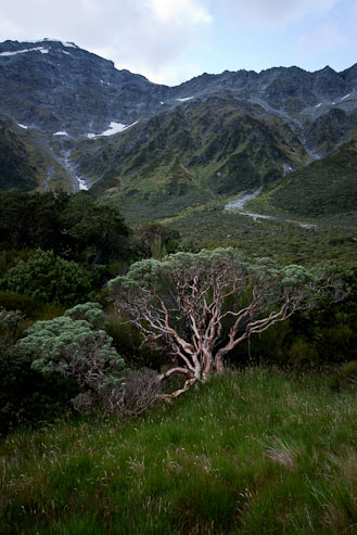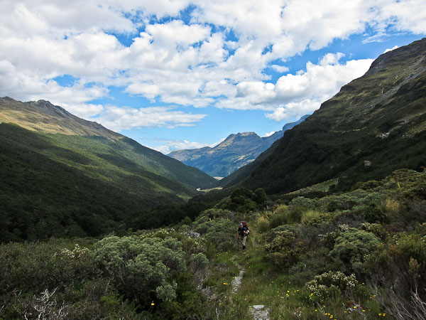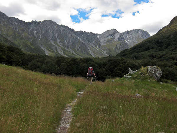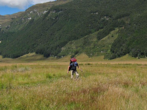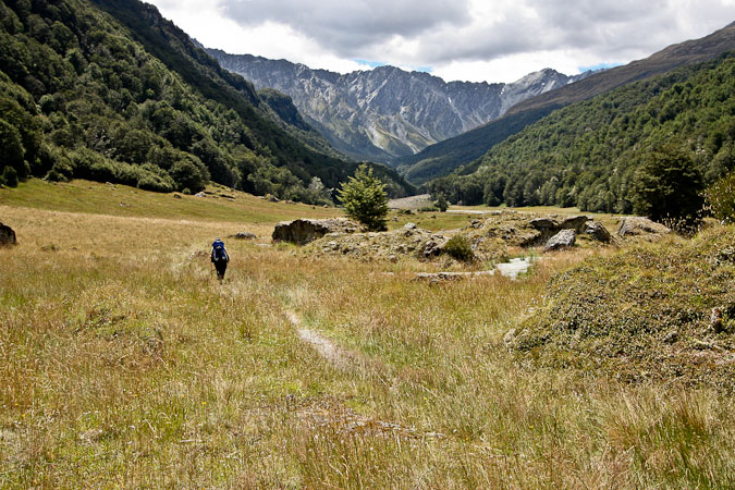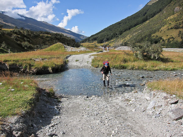 We start hiking ~10am, under some clouds that are quickly burning off, and follow a road that leads to a trail along the grassy banks of the Rees River. There are lots of muddy swampy grass areas, and we are glad we're wearing our gaiters. The trail makes some steep climbs and descents above and back down to the river, which are quite tricky. We realize that given the lack of recent rain, the river is low, and we could have bypassed some of these undulations by sticking to the river bed (we do so in the future). Several stream crossings are encountered, but they are all easily walkable in boots with gaiters, and our feet stay dry. In one particularly muddy spot, I sank to within 2" of my knee.