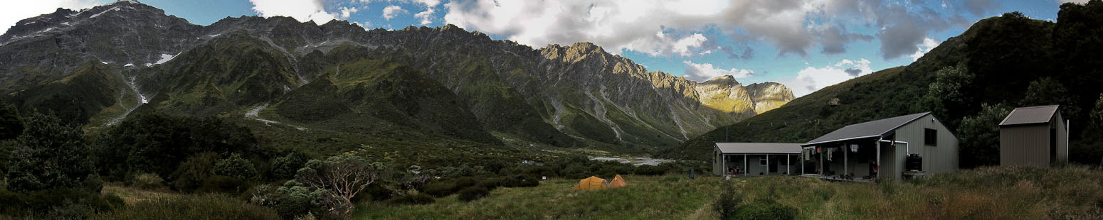 Just enough light through the bunkroom windows to write this without a headlamp… Wendy had a big dinner: 2 hardboiled eggs, salad (lettuce, tomato, onion), dehydrated pumpkin pie, 200g smoked salmon, yams, cheese and carrots. I ate little, and wasn't hungry for some reason, which often happens to me at the start of a backpacking trip. Just some yams, a little salmon, and some choc squares w/ 2 tbsp of PB. Wendy drains her heal blister after dinner. I tape up my flip-flops and take photos outside in between bouts of stretching, while soaking in the mountain views. The sandflies are out, but not awful. The older couple is already to bed. Same for us now. We want to get up early for sunrise.