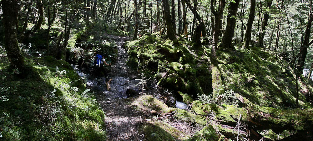 I've had LOTR tunes in my head all day, much better than the usual annoying pop tunes from the gym radio that hounded me on 14er hikes this summer. It was super hot in the open grass plains at mid day. After another hour of grass flats and mud, we reached the edge of a forest (~1:20pm), grateful for some much appreciated shade, where a sign marked the halfway point of today's hike. We ascended into the mossy green forest for quite awhile, made a brief descent, crossed a bridge, and saw several waterfalls as we traveled in and out of small meadows cut by cascading water. I stopped every 30-45min to eat half a PBJ sandwich.