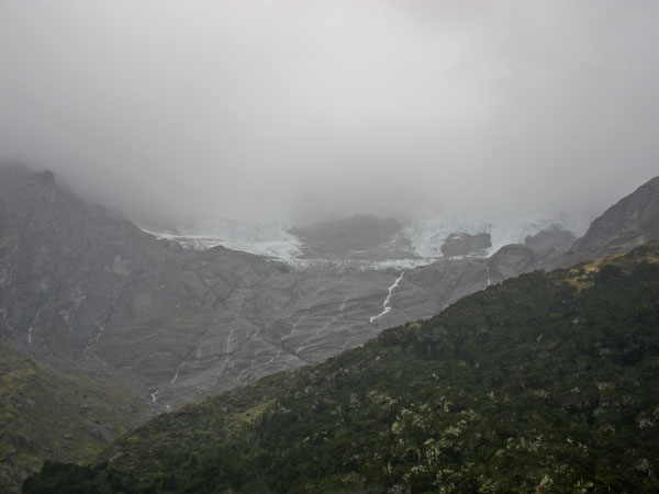 Got lots of time for writing today. Didn't bring cards… It's too cloudy for Wendy's solar charger to work right now. There's lots of Israelis on the track with us, 10 out of ~22 of us. Lots of Hebrew. They all finished their army service and are traveling before starting university. Time passes, more rain, and even a thunderclap! There was a spectacular waterfall just before reaching the hut, which I didn't want to take my camera out for in the rain. That must be even more impressive now. There are still others that haven't arrived, and people are wondering if they'll be able to safely cross the streams. The rain is supposed to ease overnight. Lots of people are napping in their sleeping bags now. Not much else to do…. Wendy is about to venture to the bathrooms. Rain is still pouring. We were super fortunate (and wise) to start early this morning, avoiding the heavy rain and any nasty crossings. These huts are very nice. Tenting would be miserable right now... 8:30pm, Daleys Hut I was just about to head outside for some pics, but it clouded up and poured, just as I was going to step outside…. A few others arrived, reporting tough crossings. Still waiting for a few others that haven't arrived (and it's 8:30pm!). Not much light left. The rain subsided the past hour, and the river has finally dropped a bit, so hopefully they will be able to make it (though it's raining again now). There is a rock shelter place half way between huts, though they don't have a tent. Spent lots of time chatting with some fellow trampers (a 6'9" guy from Israel, and the "elderly couple" of the group) about NZ hikes, and shared pics from each others cameras. I finally ventured to the bathroom during a lull, and the path was not too muddy fortunately. The warden visited us, and collected our hut tickets for the entire track. He also confirmed our jet boat pick-up plans for tomorrow. A couple of us showed him pics of the river crossings, which gave him an idea of the water levels spread out over time. The stove is very toasty. For dinner, Wendy actually requested WG ("World's Greatest"). We mixed in her extra dehydrated veggies. For dessert we finished the pumpkin pie. Still way too much food left, and this was our last dinner of the track. Great views from this hut. A mountain with a glacier is visible from the window. There was a moment of clearing, with a few pieces of blue sky, but now we're swamped in rain again. I even motivated myself to put on wet socks and boots in order to go out and view that waterfall around the corner, but got rained out. Maybe it will clear up again before dark. It's supposed to clear up overnight.