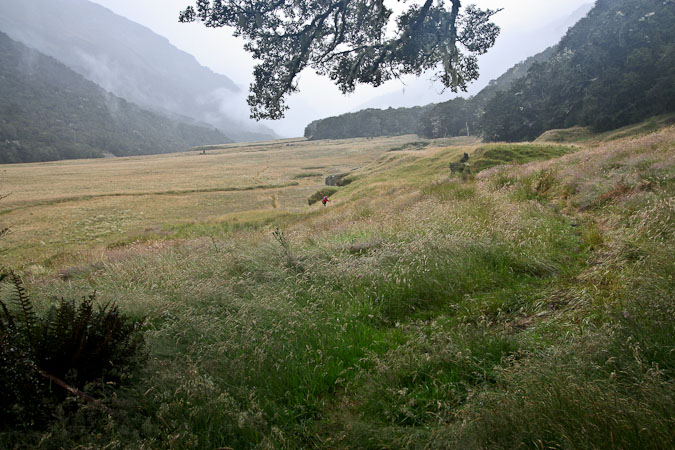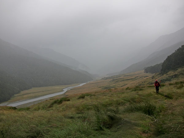 Next up is a long hike across the beige grassy (and muddy) rolling Cattle Flats, with the river to our right, and hilly forest to the left. The trail undulates up and down, with small stream crossings, and passes through small forest patches in-between more grassy flats. The rain and wind pick up. We think we're making great time, but might be too optimistic. We're playing leap frog with 3 other fast hikers, Not many pics today, too rainy for the camera. Nothing much to see in the forests, though Cattle Flats probably has some good views we're missing. We can see the ends of glaciers hanging down on the mountains across the river. Plenty of waterfalls today, and still minor stream crossings.