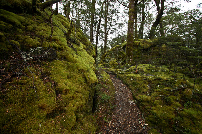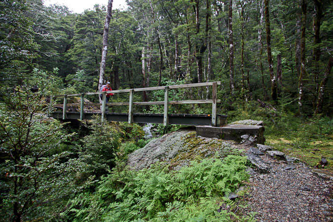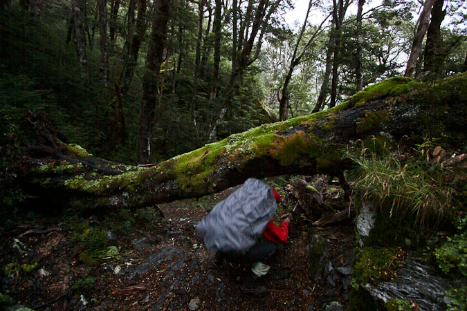 The trail leads to a rocky creek, where parts of the trail have been washed away, designated by yellow tape. The detours are steep and slippery on wet/smooth rocks and roots, which climb up and around giant boulders. The Rees-Dart is known to be a rougher trail than the Great Walks, and indeed it shows. As we reach a slightly cascading stream crossing in the forest, some hikers approach from the other side. We both search up and down for the best course. It looks like a route with rocks might be doable, but a slip would result in a nasty fall, so we just take the calmer, wider area, and wade across upper-shin level water. The hikers say it's still 2hrs till the hut, which is surprisingly high.
