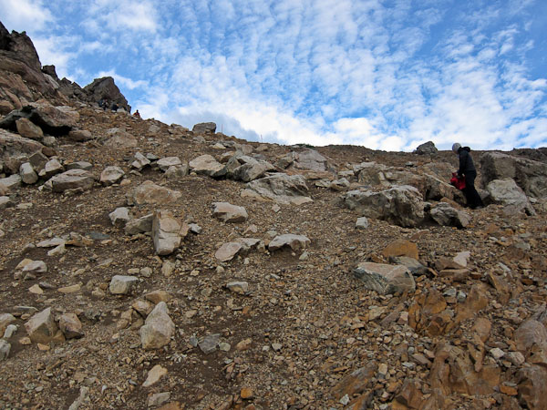 Clouds were starting to form as we ate hot cereal, using the supplied gas stoves. We were anxious to leave early, before the forecasted a.m. drizzle. Wendy took some ibuprofen, and would have to go on with a sore knee. We loaded our packs (I carried everything, so Wendy could have a virtually empty pack), and ventured out into the wind torn rocky expanse below Mueller Hut.