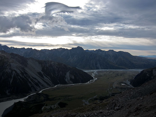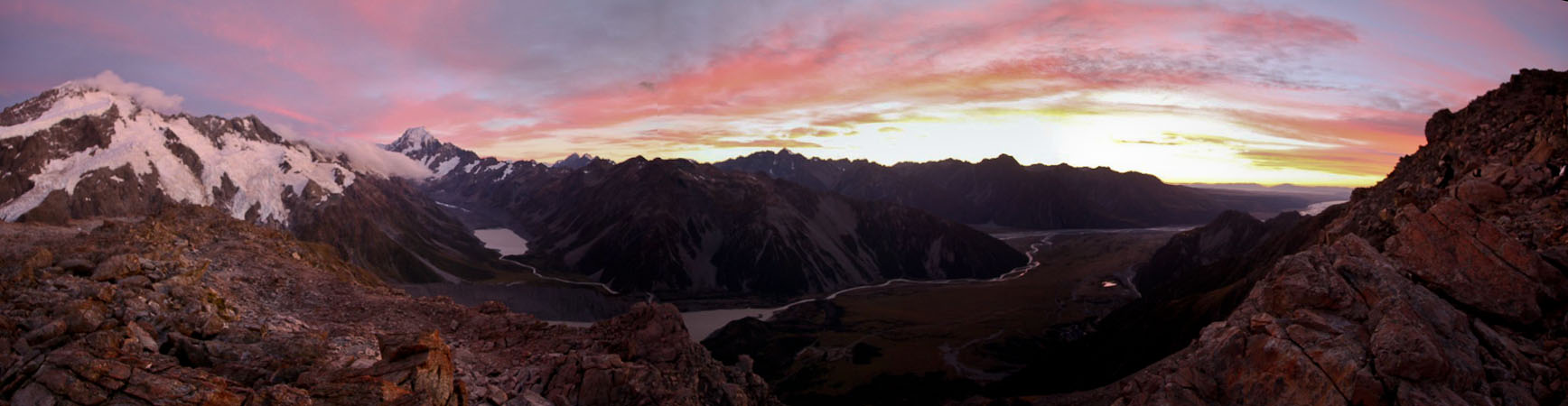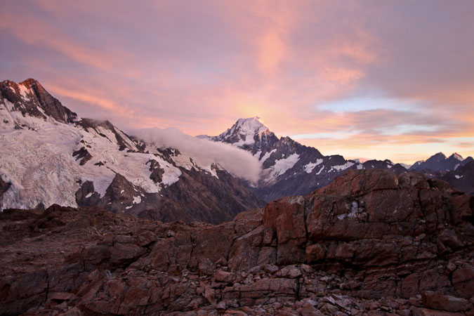 Gear is strewn about the floor yet again in prep for the next tramp… Wendy woke me up ~6am, as lots of people were up and getting ready for sunrise viewing. The wind was still ferocious. I was tired, but got up anyway to check it out. The skies were mostly clear skies in the pre-dawn light. Soon the thin clouds got pink. I went out to the rocks in the wind, taking pics for a few minutes, and returned to the hut to start breakfast with Wendy. Then Mt Cook got lit with pink, so I had to go outside for more photos.