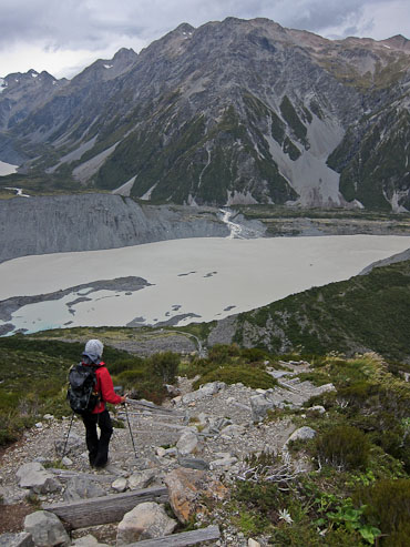 The rest of the descent was steep, and Wendy did well given her bruise. The sky completely clouded over, and soon started misting, reducing all views of the glacier and Mt Cook to nothing. That helped keep our focus on the ground. It was slow going, and there were a few drops of precipitation that didn't pose any threat, but we made it back ~11am, in 3.5hrs.