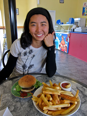 Then we stopped by the YHA we stayed at the night before to pick up some food we lhad eft in the fridge while at Mueller hut, before driving south 83km towards our hostel for the night. No views of Mt Cook during the drive out. Stopped at Twizel for lunch at a take-a-way eatery. Seafood platter (fried, with chips), and a cheeseburger. So-so. This was the biggest town we'd hit today, so we loaded up at the grocery store with food for dinner tonight, and filled up the tank, before heading to our hostel, Bus-cut in Omarama.