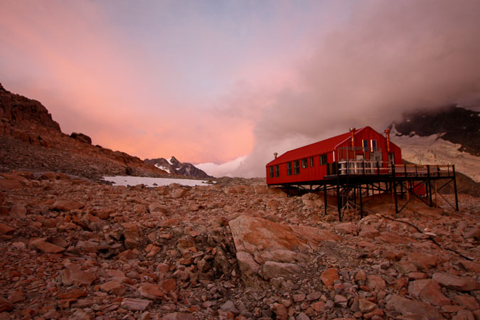 Looking back at Mueller Hut, and out at Mt Cook just after the sun rose...