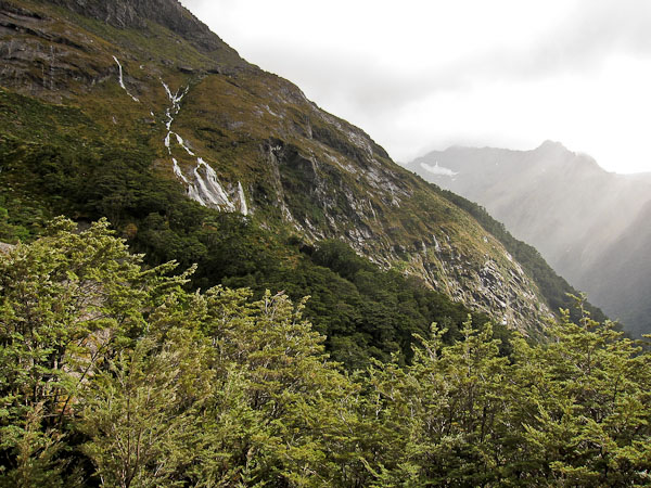 We continued on the trail ~3:30pm. It was all sun, and little wind, making us quite toasty. We traversed high up the side of a valley overlooking the Hollyford River, and several hanging valleys and peaks on the far side to the south. We crossed several small bridges, and filled up the water bottle in a stream. The water was a bit silty, and I tried another stream, which tasted great.