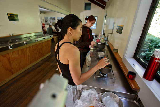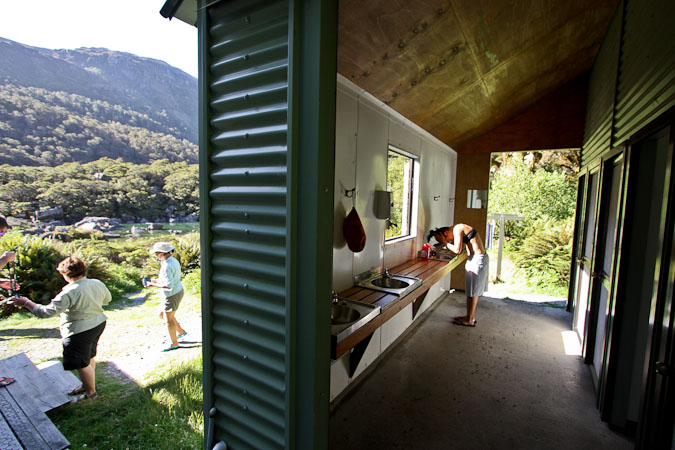 Still in bed, resting weary eyes, while rain and wind continue to pound the hut. Too many door slams and boots stomping to sleep any further now. Some people must be in a hurry to move out. Got lots of sleep (didn't need to go to the bathroom till 8am). The waterfalls are very big today. It was chilly last night, but I woke up in the middle of the night sweaty, and unzipped my bag. It's much warmer out this morning. The bugs sure haven't been much of a problem on our tramps so far.People bring lots of "big" food on this track, and large bins of stuff, fruit, steaks, mince meat… My throat is still feeling thick, and sinuses are semi filled, but no runny nose today. I think I'm fighting a cold pretty well. Wendy is reading in her sleeping bag. We may not leave here till ~noon, or whenever the skies start clearing. It's a 4.5-6.5hr hike to the next hut, and we trend to the fast end of the spectrum. There's also a 1.75hr side strip to Conical Hill we want to do. My window view hasn't been any use here with all the rain. Still not hungry after last night's big meal. 10:17pm, Mackenzie Lake Hut We finally get out of bed ~9:40am this morning. The weather update still calls for a clearing in the afternoon. It was still raining as we ate breakfast (cereal, hard boiled eggs, cheese). The temperature was 70 degrees on the thermometer last night during dinner, and 38 degrees out this morning. The clouds gradually started thinning, and people were lining up, ready to start the hike ~11:00am. A little kid in the kitchen looks out the window and shouts, "Blue sky!" in a thick Kiwi accent.