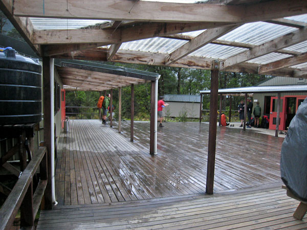 The rain is heavy now. My camera is still not working, and I filled up an SD card today. There's a fire going in the wood stove. People are arriving wet . Lots of clothing hangs above the stove. They could certainly use more drying racks here. Kind of surprised the Milford doesn't have more, given the frequent rain storms. The hut talk is at 7:30pm tonight. We're sitting at a table near the windows. Others are using headlamps in the dark corners of the common room. Many people have arrived exhausted, and are taking naps. This is probably not the vacation many of these folks imagined when they booked this track 8 months ago for their one tramping vacation of the summer.
