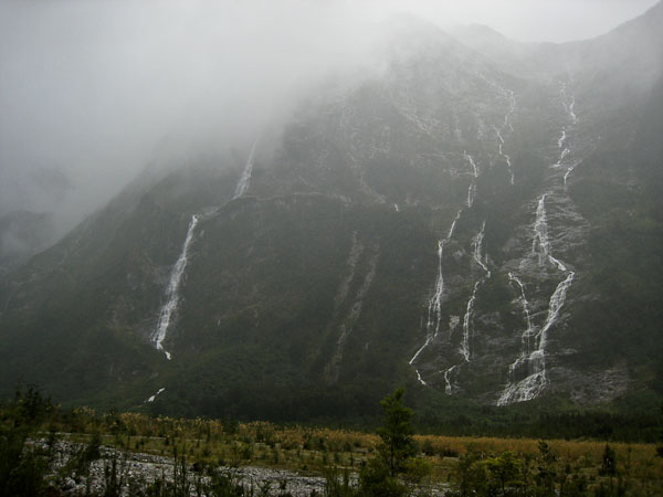 The trail ran in and out of the forest, yielding periodic open views of the towering cliffs on each side of the valley. One word: WATERFALLS! So it's true… The Milford track is still magnificent in the rain, and some would argue (including me), more enchanting with an endless gallery of streaming falls sandwiching your peripheral vision. Certainly impressive. It pays to have a good rain storm, at least on day 2 of the Milford track.