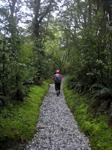 Given the rain, the trail was still an easy walk, with no stream crossings of any concern. The trail was impressively built, with drainage canals along the sides. The Milford is certainly the best maintained trail I've seen. While passing through a clearing, the impossible happened, a ray of sunlight hits the ground. The moment was very brief, but notable on a day like today. However it wasn't an omen of things to come, as the drizzle set back in.