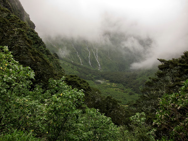 I was tempted to wait longer, in hopes of the clouds lifting from the peaks, but the clouds look strong, so we start our descent in the sun. Soon I have to take off my hat and a layer. Ahead of us, across the valley, is a towering mountain, with dozens of waterfalls threading down the dark steep rock walls.
