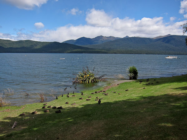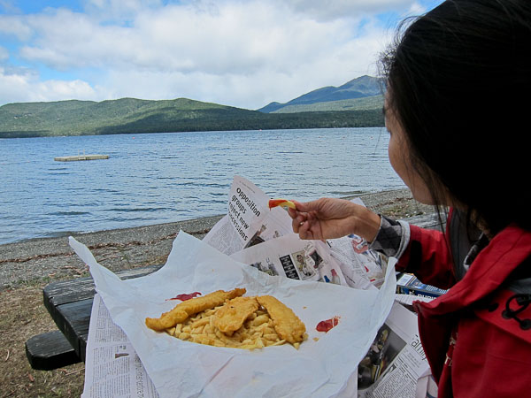 Eating our fish and chips along Lake Te Anau...