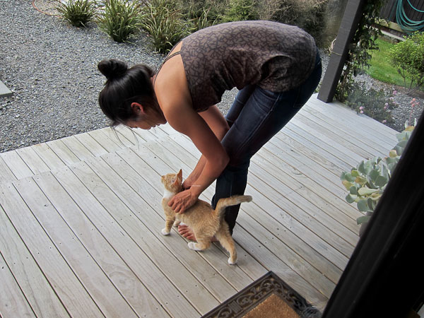Wendy plays with a friendly kitten. Steak and salad for dinner...