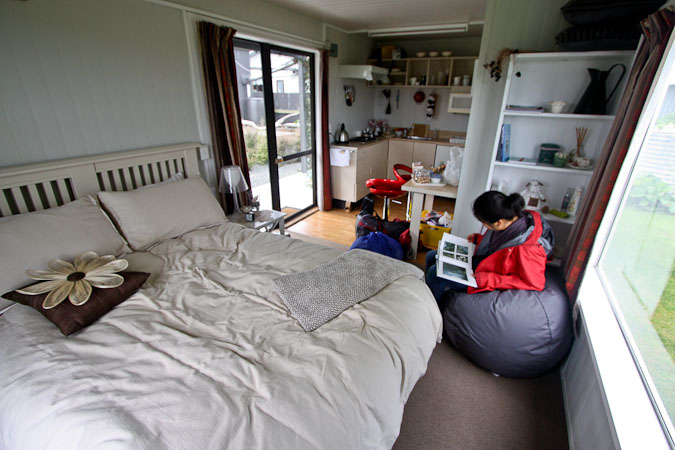 After lunch, it was time to say good-bye to Te Anau, after spending 3 nights here over the past week. We drove south along the lake through Manapouri, and then across rolling farmland to Tautapere, arriving at our Bed and Breakfast ~2:45pm. I head read grand reviews about this cozy full-inclusive suite, and we were quickly thoroughly delighted with the place upon arrival. The owner greeted us, gave us a tour of the room, and pointed out some homemade coconut, apricot, raisin cake left for us on the counter. I found the place online, and booked it online this morning (surprised it was still available), since there wasn't a phone # listed. Turns out, if you bypass the online booking, she'll charge you a sweet discount ($80 vs $98). Unfortunately the phone # isn't posted online, but here it is; 03-226-6238. Or direct email: p.nutandjanice@xtra.co.nz. Then she said she'd be back with a breakfast tray soon. Cool! There are sheep in the back yard (I later found out the owner orders 8-10 a year, fattens them up, and slaughters them come winter for meat).