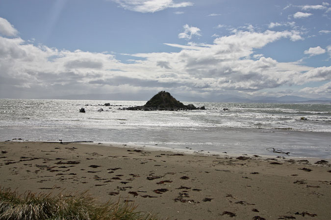 After some tea, we drive down the coast, stopping at sites along the way. It's very windy, and apparently this is the norm, given how all the trees lean sideways here. We check out Monkey Island, a small island that is land locked during low tide. We get a bit lost on some gravel roads, but end up back on track. The late afternoon sun breaks in and out of the clouds, turning the hay-grass gold above the rocky shores.