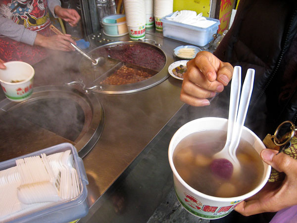 On our walk back, we stopped at numerous food vendors accumulating small snacks for lunch. I even tried a grilled sea snail, which was surprisingly long when the lady yanked it out of the shell (tip of the iceberg shows). Other highlights were NT10 red bean and rice balls (we ordered 6 to go), squid on a stick, sweet bean soup with colored flavored rice sticky balls, and shaved peanut brittle with cilantro and ice cream, wrapped in a rice tortilla (interesting, but didn't pan out as well as I had hoped). No bubble tea on the premises though.