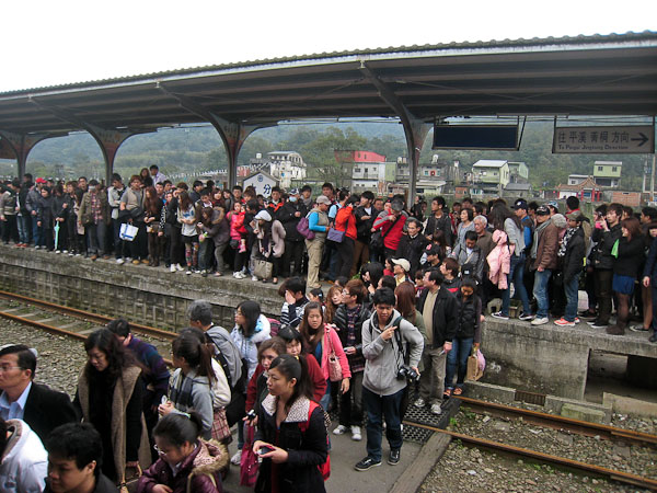 ~3:15pm, we hopped on a bus back to Ruifang, where we transferred to a crowded train towards Pingsi, home of the lantern festival. We had to stand, packed like sardines in a can.