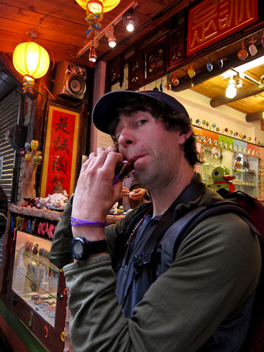 The guy isn't smoking a cigarette, he's playing a small ocarina. I spent a long time here picking one out...