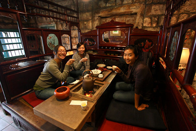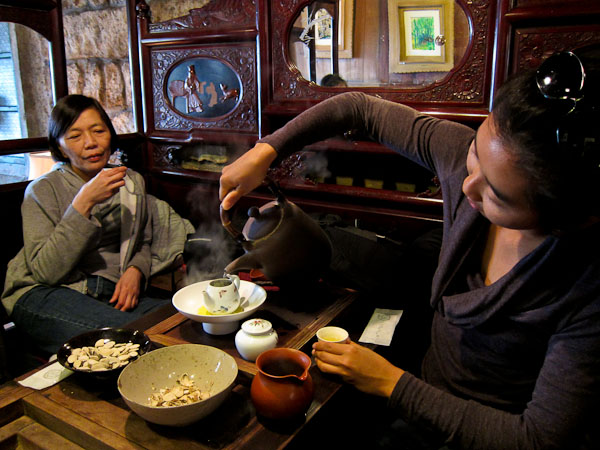 It took a good hour to walk to the end of the street, where we decided to go to a tea house. We happened to pick the oldest tea house in town, 100 years old. Our visit was quite long, and well orchestrated by the tea servers, who explained the multi-step traditional process of seeping, priming, and finally pouring the tea into cups. We also ordered some roasted melon seeds to snack on, while sitting in our bed, legs folded, with a tray as a table. The experience and atmosphere was quite top notch, as was the bill. Afterwards, we walked around the clay studio in the basement. Wendy bought a small tea pot.