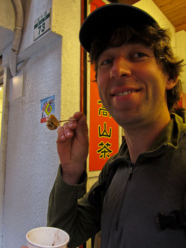 We figured we had seen enough to get the gist of the festival, and wanted to try to beat the infamous post-festival crowds on the trains out. Plus it was starting to rain, so we made our way back past all the food vendors, fighting to stay together among the crowds, and stopping for dumplings and squid on a stick. The railway platform was packed with people, but we found a spot to sit down on the far end.