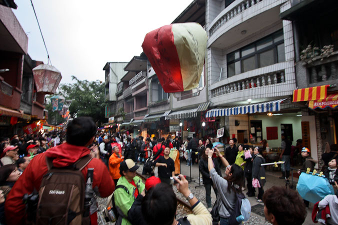 More lanterns filled the sky, and we searched for a good viewing point. At 6:15pm, a couple hundred lanterns flooded the sky at once, making for quite a "wow" moment. We walked around for a better viewing spot, but there was too much street lighting that got in the way. We were just deciding to head back, having seen enough, when another couple hundred lanterns rose into the sky again.