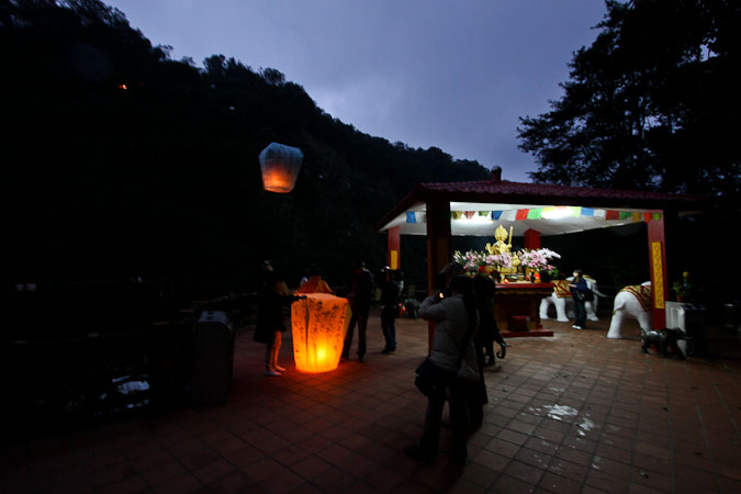 People were setting off large flaming lanterns from the railroad tracks (in the large period between trains). We continued on, and decided to make the 30 minute walk to the famous Siphon waterfall, since we had some time to spare/kill before dark. Lots of people were out for the walk too. It was NT80/person to visit the viewing area for the falls. Hard not to pay it when you've made the walk to see the falls. I set up my gorillapod and got some decent milky shots of the falls. Some people were setting off lanterns here too. We saw several spent lanterns falling down into the forest and river, some which tumbled over the falls. Guess the whole "garbage" element of the celebration isn't a concern. One of the lanterns seemed to start a small fire in the hills, but didn't amount to much. It was actually starting to drizzle as we headed back to the main pavilion area.