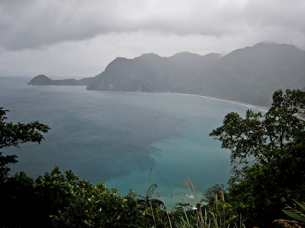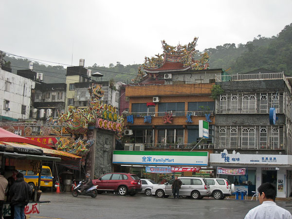 We passed through several tunnels that cut through the mountains to the southeast of Taipei, where we came to the painful realization that our Lonely Planet guide book was missing, likely left in the lobby of the Hero House hotel. Doh! Fortunately we had another guidebook, but LP is a big loss. Hopefully the hotel attendant we called finds it for us to pick up next week, since it's a library book. The skies were completely overcast and light rain fell, symbolizing our grief at Lonely Planet's dis-appearance. We made great time through the tunnels, and soon reached the shoreline, with cloud obstructed views of the mountains rising above the ocean. The forecast was supposed to be decent today, so we stopped at a town, just south of Su-ou, ~11:30am to check out lunch/snack options. It was famous for it's fresh fish. We walked around in the drizzle, eventually buying an array of exotic fruits, dried fish to bring back for Wendy's dad, bubble tea, sticky rice balls with sesame, and cooked sweet potatoes (native variety). The snacking continued into the car during the drive south.