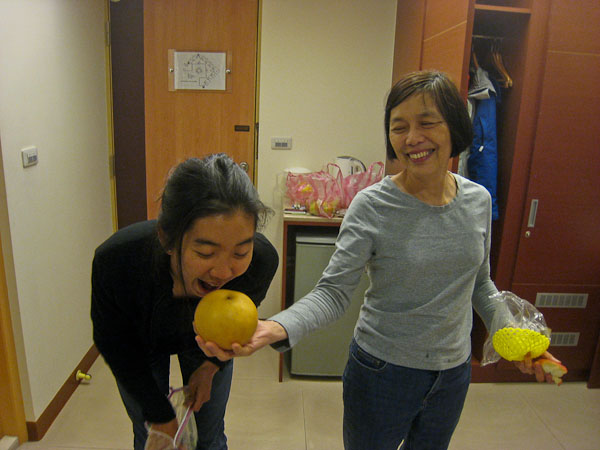Back at the hotel, we ate some of the exotic fruit for dessert. I had a date (green skin, and like an apple/pear, not very sweet, unlike the dried version), and shared in a huge asian pear.