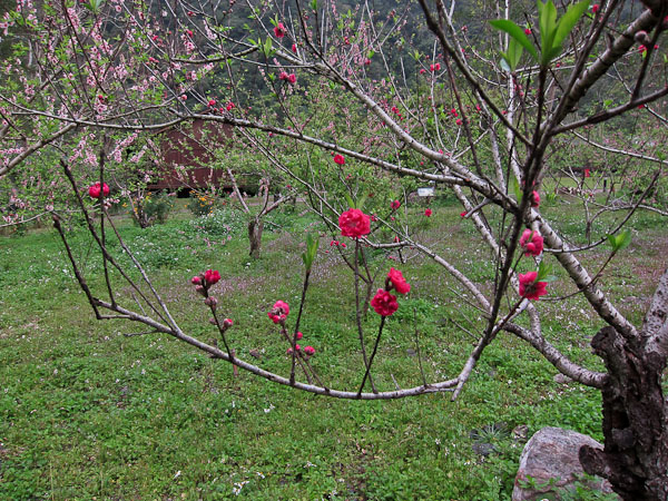 Another 10 minutes up the road brought us to Tianxiang, where we drove up to the Youth Activity Center, located at the top of the hill, looking out across the gorge. Our room was big and sweet, and there was free wi-fi, much to our surprise. The cafe served dinner 6pm-7:30pm, and it looked good, as we watched them set it up. But first we wanted to check out the temple and bridge at the base of town before dark, and investigate the 2 other eateries in town.