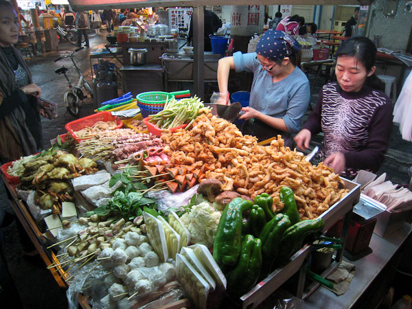 We are hungry, and ready to check out the markets, but first need to decide on plans for tomorrow's lodging. We decide on Meishan Youth Center, half way across the south central highway, and Irene calls them up. Surprise! The highway is closed do to a recent rock slide! Good thing we find out now, so we can make alternate plans. We walk to town, thinking of other alternatives, but quickly get distracted with all the snack/food vendors we encounter in the next few blocks.
