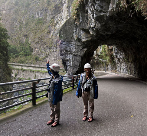Next I drop off the Changs at Swallow Grotto, park the car ahead in the tunnel, and meet up halfway. There's more swiss cheese tunnels carved into the rock. The rain intensifies, and we open our umbrellas. We wear hard hats again.
