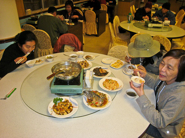 Wow, do we even bother staying to catch sunrise after a perfect performance like this? No time to answer that, since it was now 6pm, and time for dinner at the hostel. We hurried to the cafeteria, where soup was already served. Several other groups were having the same dinner. One by one, dishes were delivered to our table. Most dishes were quite good. I had been a little burnt out with Chinese food, but found myself happy to indulge in the offerings this evening.