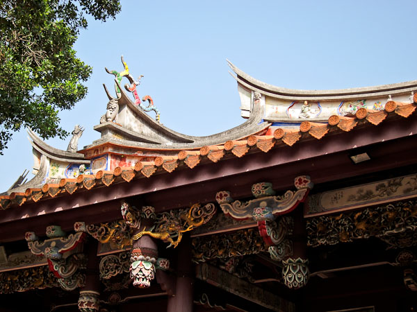 I drove us into the city, with Wendy expertly navigating us through the moped filled, LA-like (with palm trees down center divider) streets of Tainan. We found open street parking in the city center, and walked to Confucious Temple, founded in the 1600s as an education facility. Most of the grounds were free, but the main temple cost 25NT. It was a bit old looking, and not quite what I was expecting for such a "main" attraction.