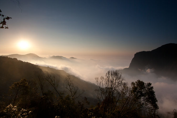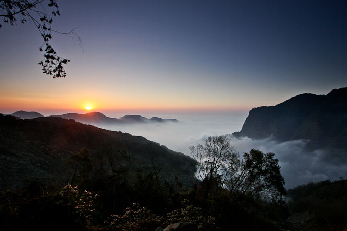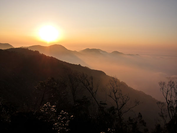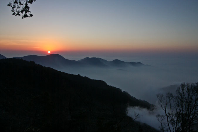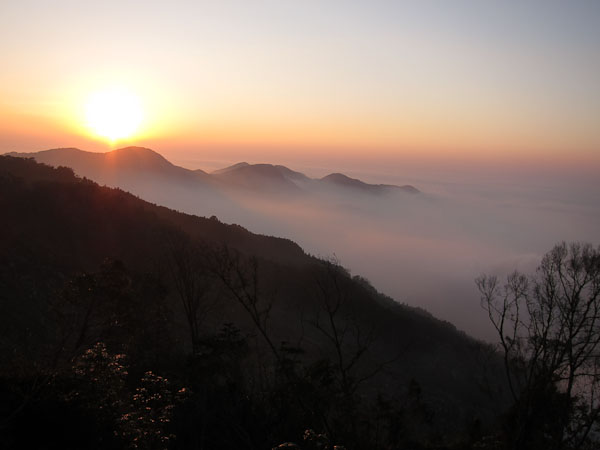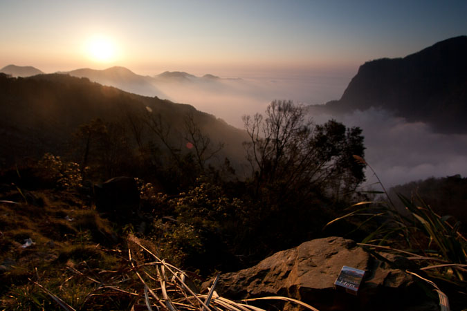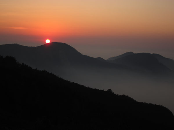 Speaking of "impressive views to the west", we returned to watch sunset a short ways up the road from the hostel. Conditions fell into place for a classic Alishan "sea of clouds" moment, where the fog settled into the valley below us, while the forested mountain tops stood as islands in front of the orange-red stained setting sun.