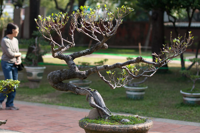 A bonzai tree on the left, and an ancient nearly dead tree (which they are trying desparately hard to preserve)...